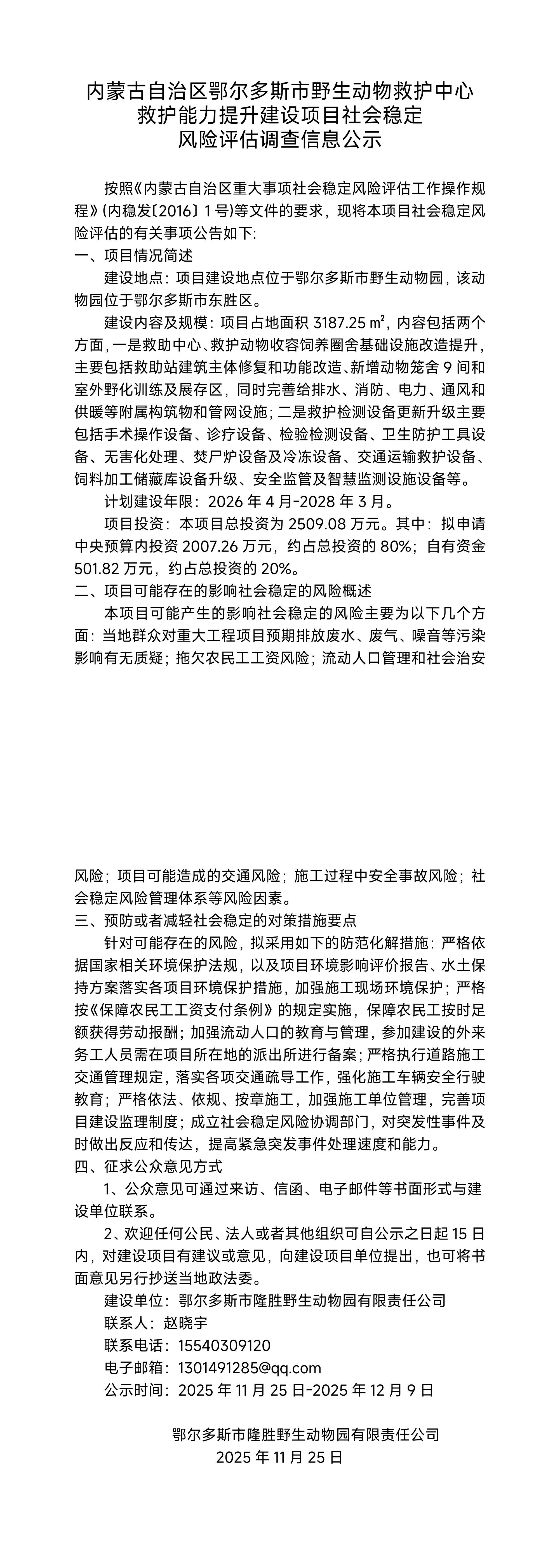 內蒙古自治區(qū)鄂爾多斯市野生動物救護中心救護能力提升建設項目社會穩(wěn)定風險評估調查信息公示