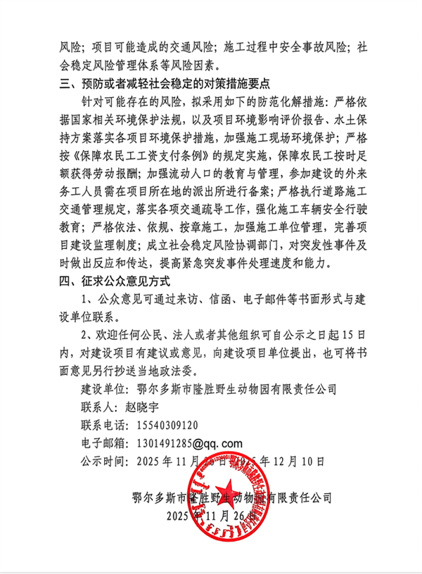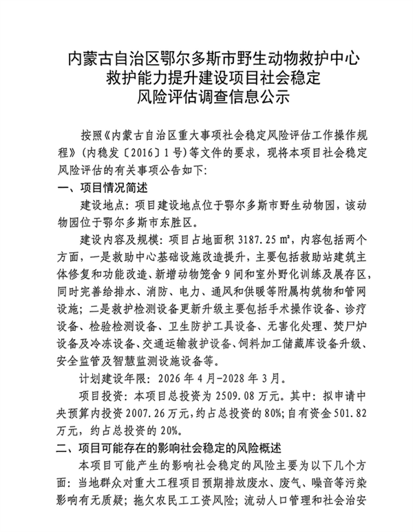 內(nèi)蒙古自治區(qū)鄂爾多斯市野生動物救護中心救護能力提升建設項目社會穩(wěn)定風險評估調(diào)查信息公示